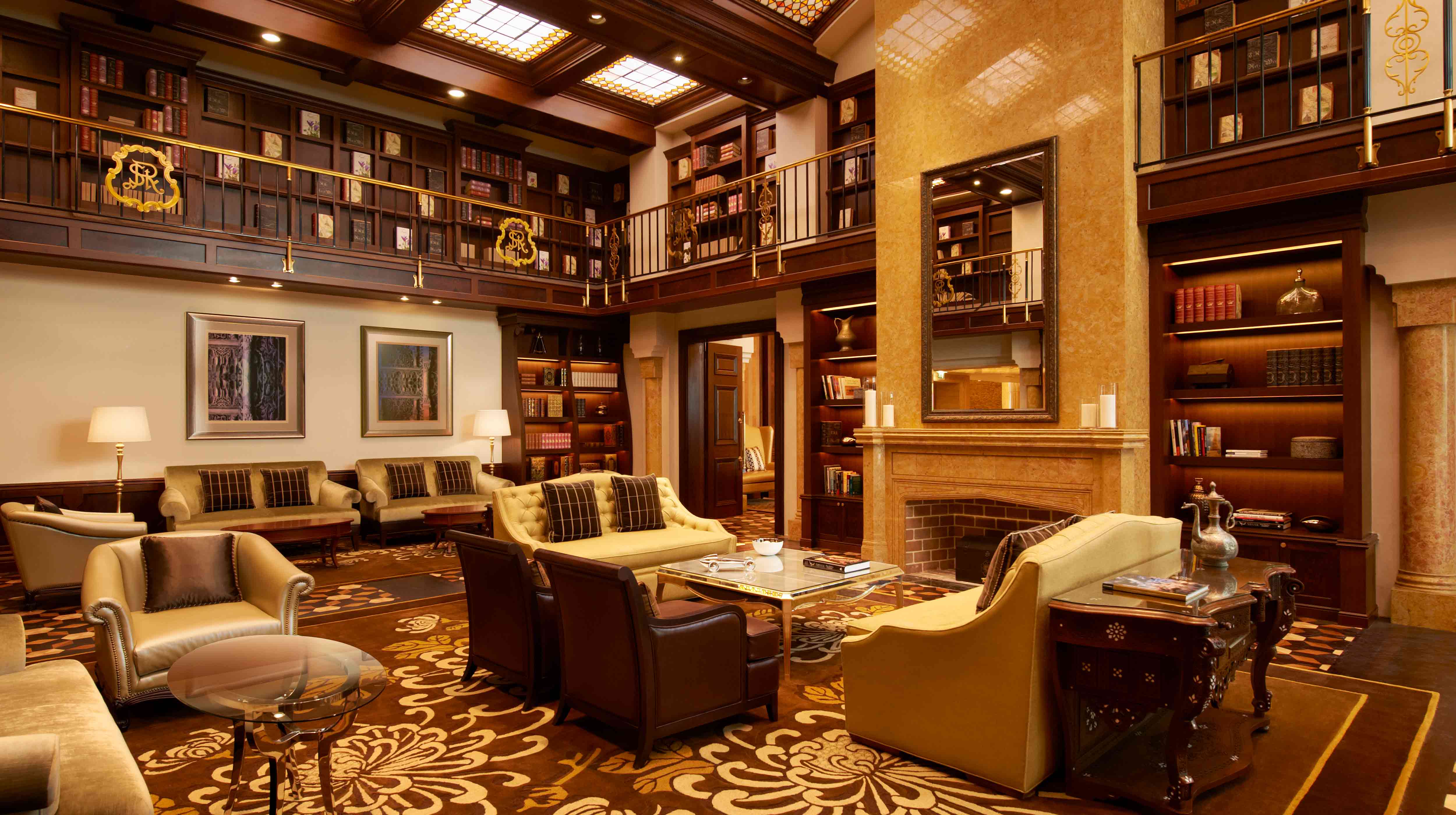 تزدان استراحة سانت ريجيس بألوانٍ غنيةٍ داكنة، فتنضح بأناقة الزمن الجميل، مستحضرةً أجواء استراحات نيويورك الكلاسيكية خلال العصر الذهبي. تضمّ الاستراحة ثلاث مساحات لاونج تتيح للضيوف الاختلاط بالناس أو الاسترخاء بعد يومٍ حافلٍ ومتعب. كما تُضفي اللوحة الجدارية المدهشة لمسةً شرقيةً أصيلة على الديكور إذ تُصوّر مشاهد رياضية عربيّة بامتياز لسباقات الجمال والأحصنة.وتحتوي الاستراحة على مكتبةٍ غنيّة مع عقدٍ نفقي مركزي في السقف يعيدنا إلى مكتبات أوروبا العظيمة.