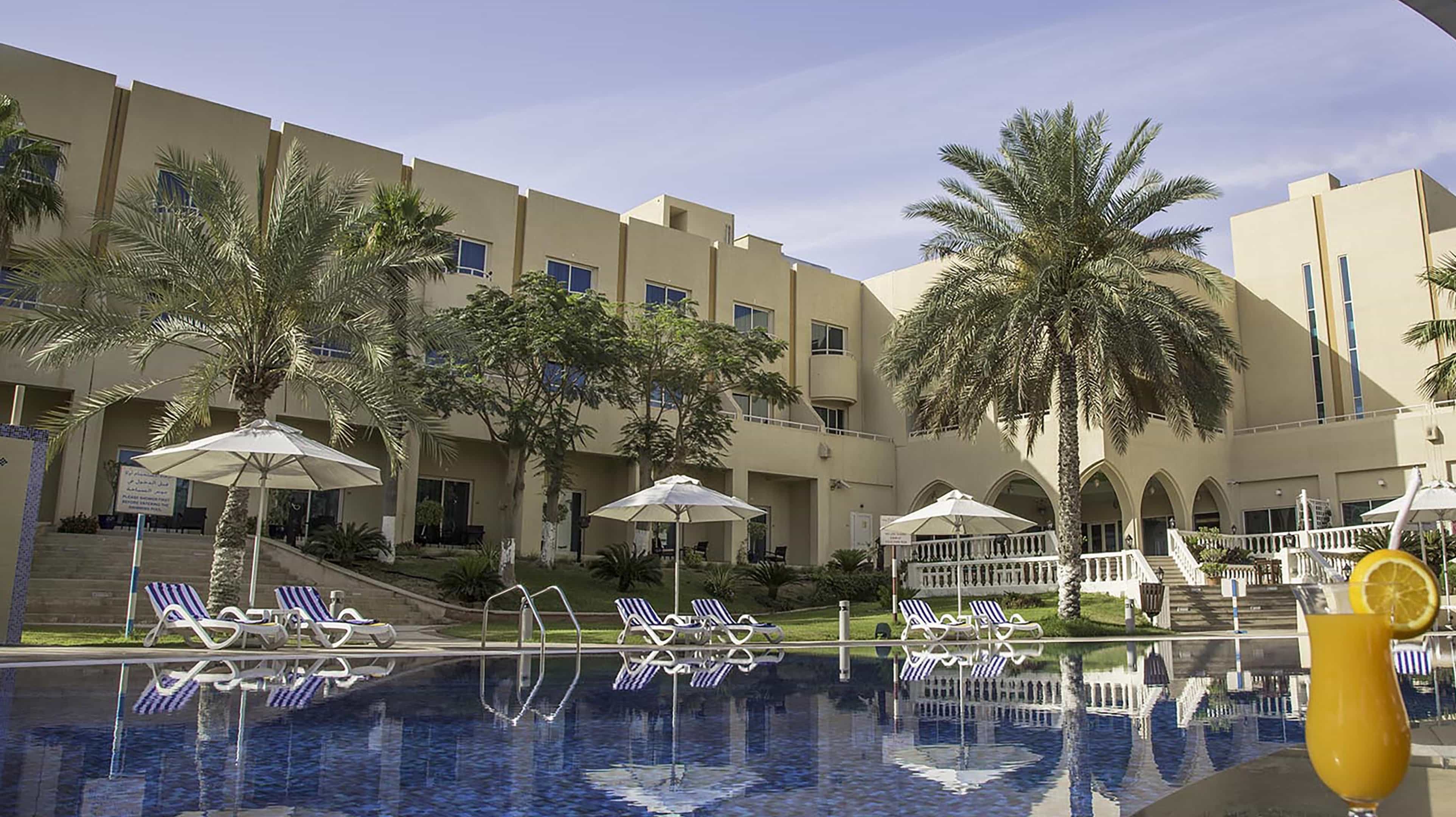 Oasis Pool Bar at Danat Al Ain Resort is the ideal spot for guests to unwind around the pool.