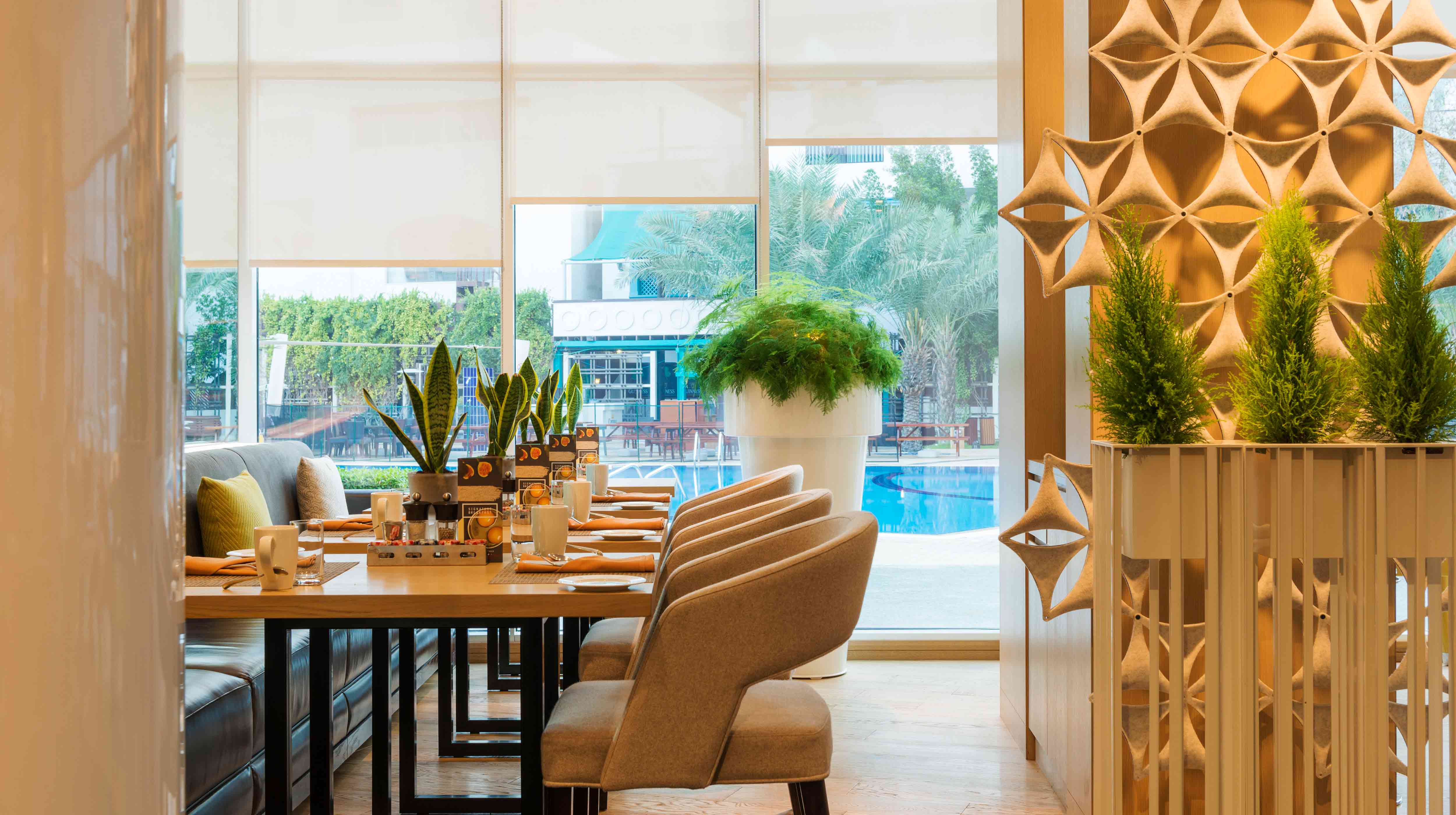 Flooded with natural light, Palm Tree Cafe offers a relaxing setting with its palm tree decor in the spacious atrium of the Radisson Blu Hotel & Resort, Al Ain.
