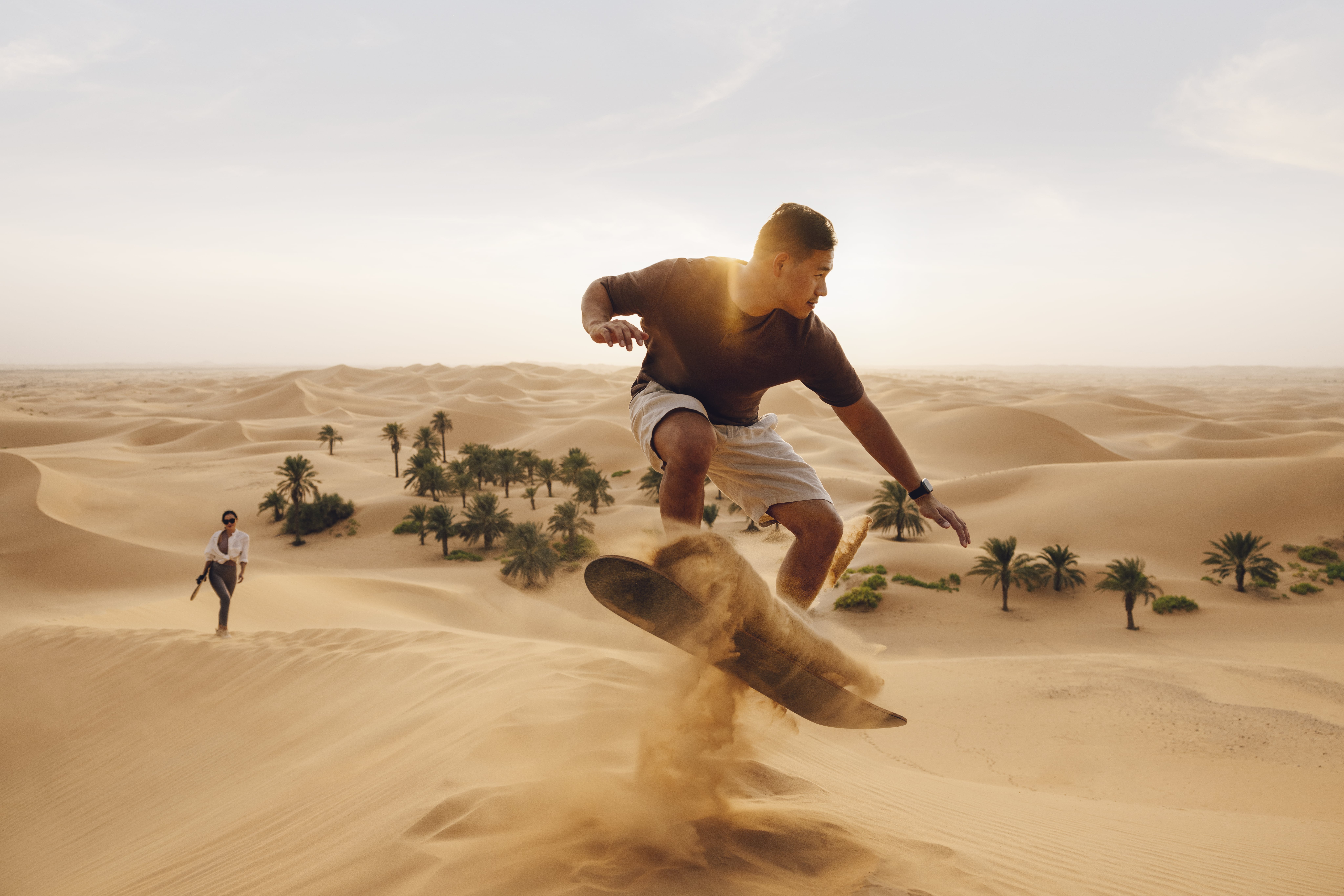 Sandboarding takes on a whole new personality when it happens on Abu Dhabi’s impressive desert dunes. Boasting some of the world’s largest dunes towering hundreds of metres above the surrounding plains, the Liwa Oasis on the edge of the Rub’ al Khali or Empty Quarter (the largest uninterrupted sand mass on earth) is a sandboarders’ paradise.
