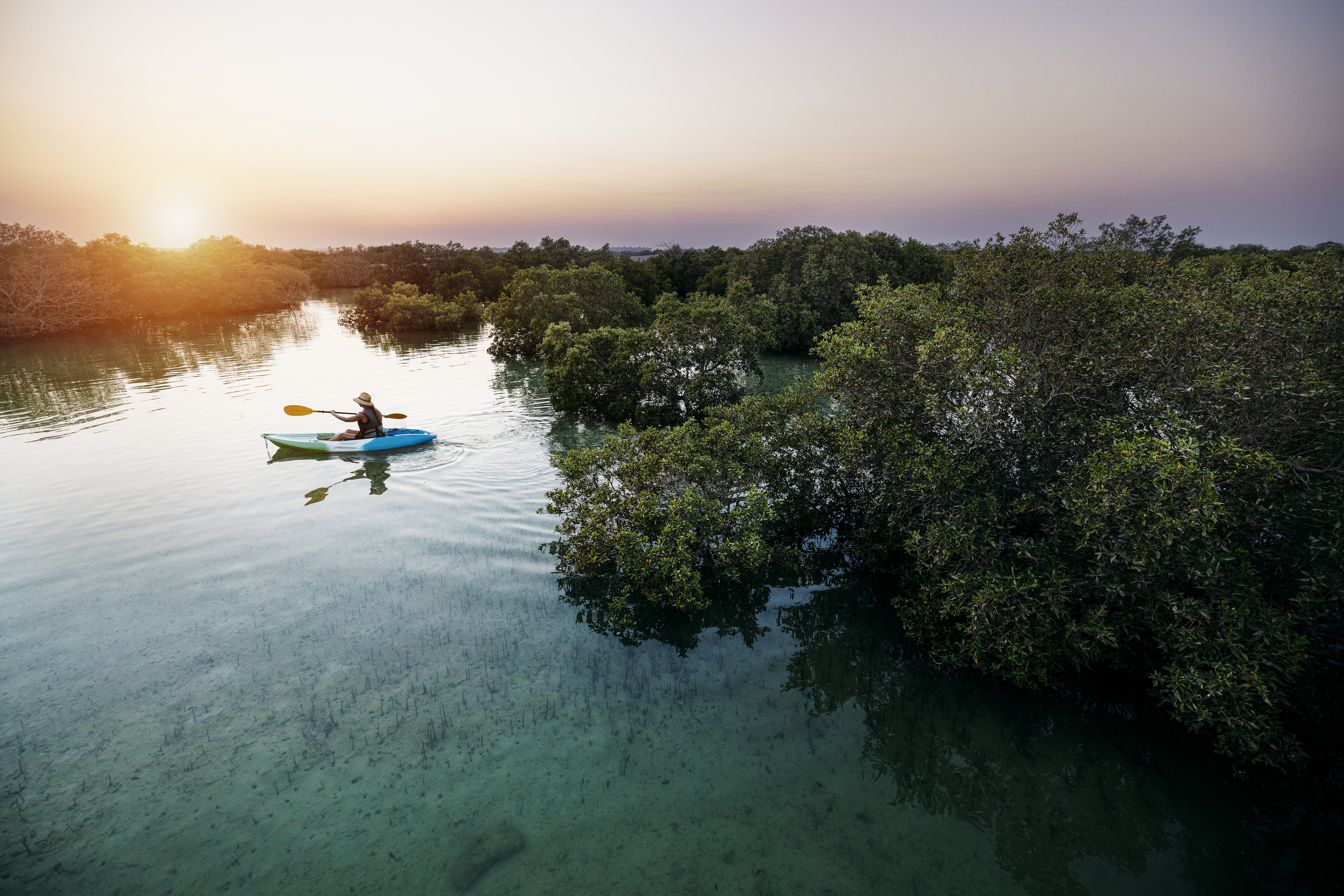 Swap the sounds of the cityscape for the rhythmic dip of your paddle with kayaking in Abu Dhabi. Depending on where you launch from, this immersive way to explore the emirate’s coastline and waterways places you right in the thick of tranquil mangroves, cultural landmarks and wildlife-rich islands. You might paddle through the green corridors of the Eastern Mangroves, float along Saadiyat Island’s peaceful shallows or experience something truly unique: kayaking beneath the iconic dome of the Louvre Abu Dhabi.